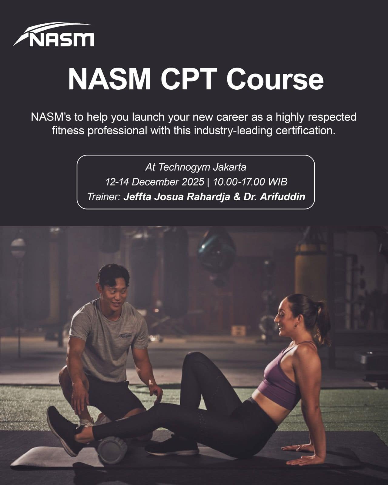 Begin your journey as a highly respected fitness professional with NASM's industry-leading certification. Join our 3-day intensive program at Technogym Jakarta, led by expert trainers Jeffta Josua Rahardja and Dr. Arifuddin.